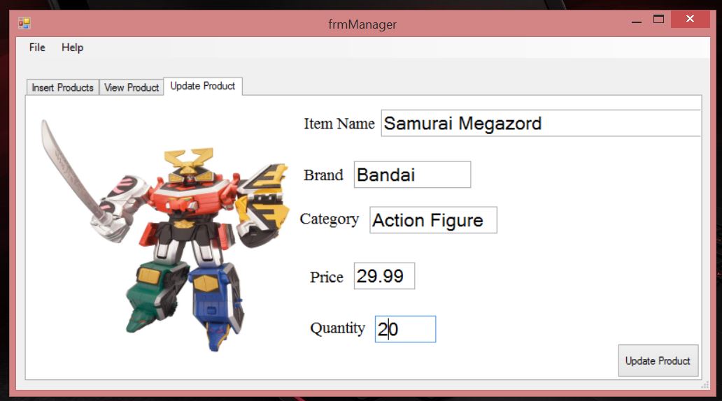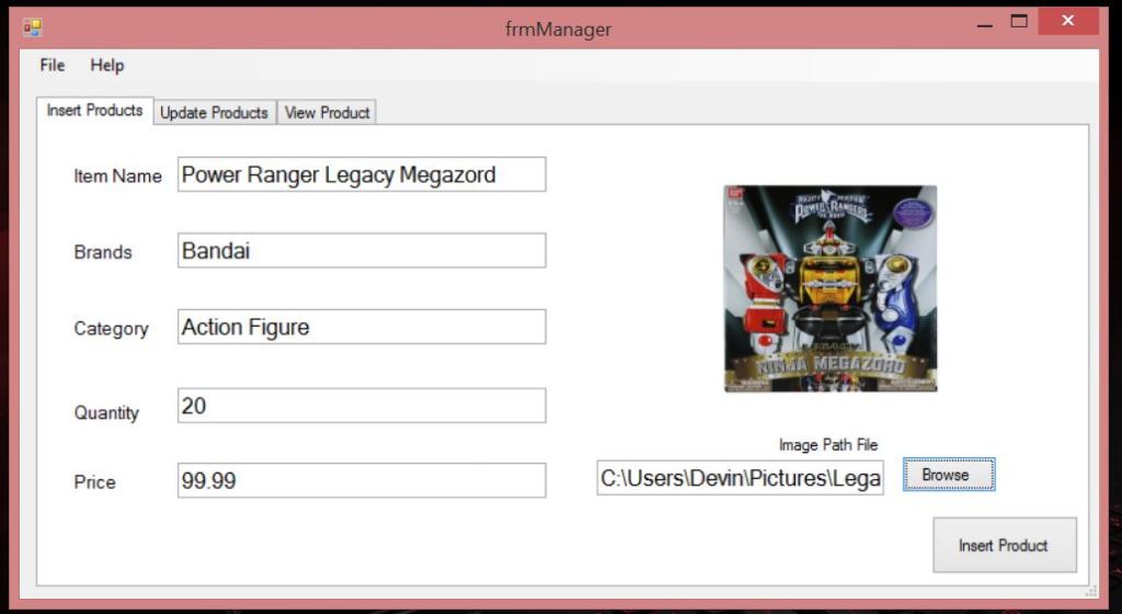 The Manager enter the data on the toy products and upload a picture of the product itself.After the Mangers clicks Insert Products Button
