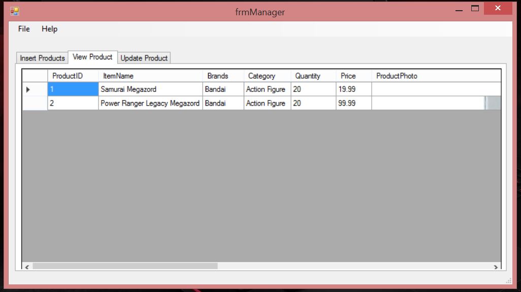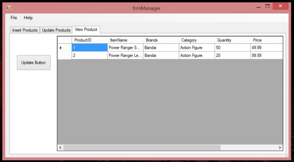 The goal of this week was to allowing the manager to insert, update and delete toy products in the manager form to be added to the toy store. it didn’t take me all that long to insert,update and delete products but i will have to revise the update and deleting part to be more easier for the manager because the current version is adequate to put it lightly and i also change the login to require an username and password instead of a email and password because it more efficient than plus the email will be used for the user to obtain a new password should they forget their old one.