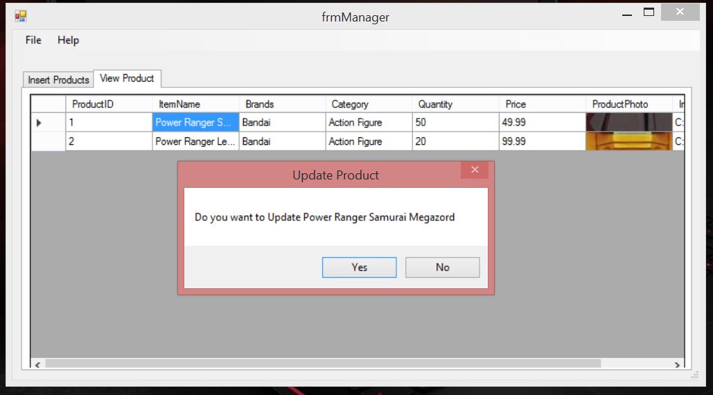 When the user click a cell underneath a column a prompt will appear asking if the user want to update info about the products in question