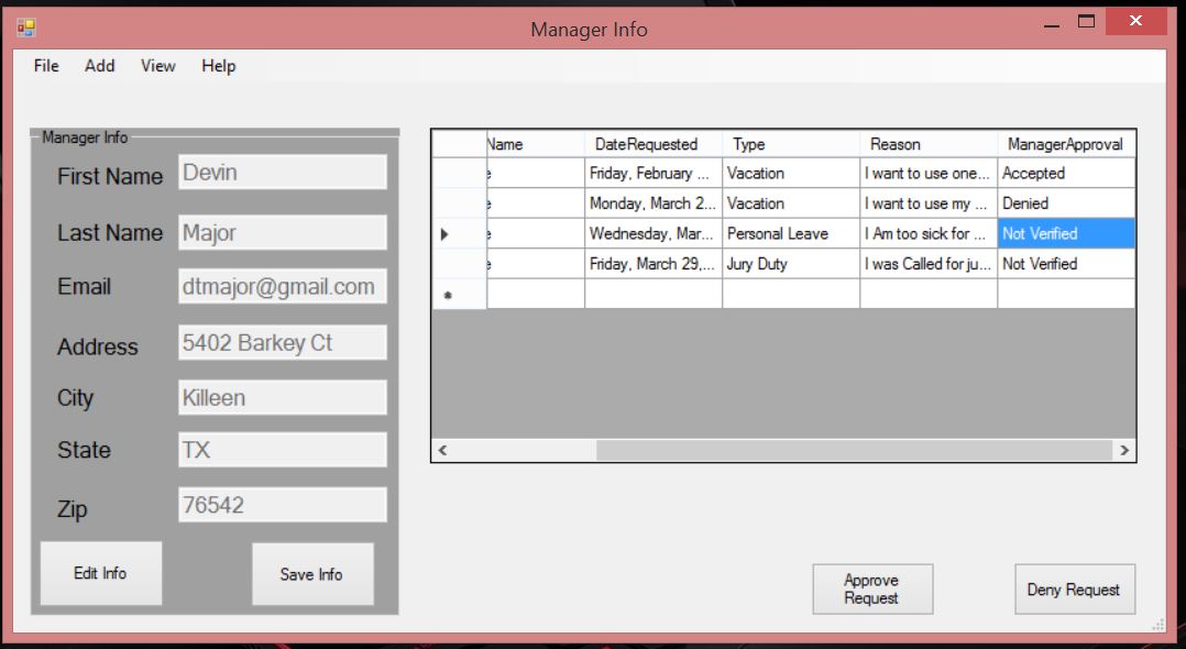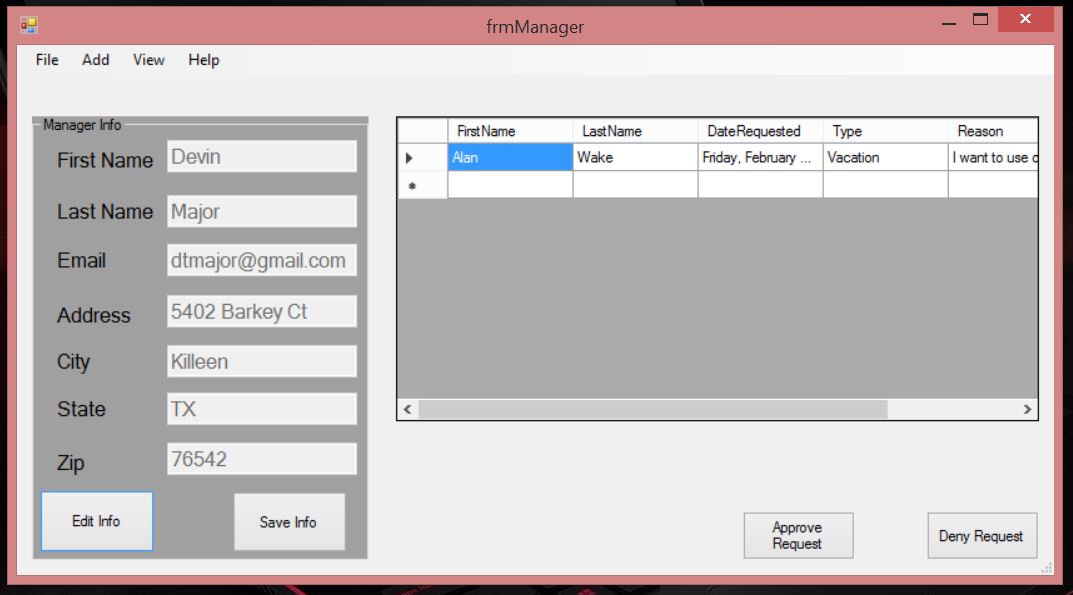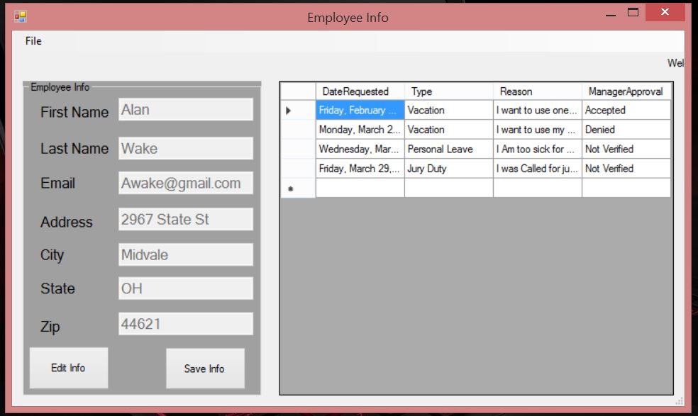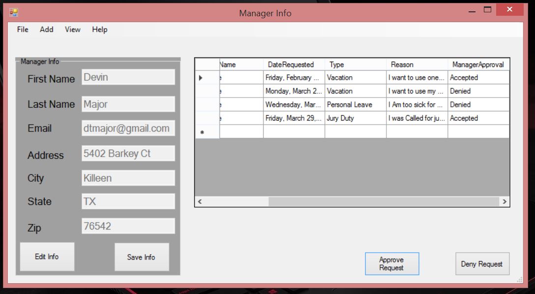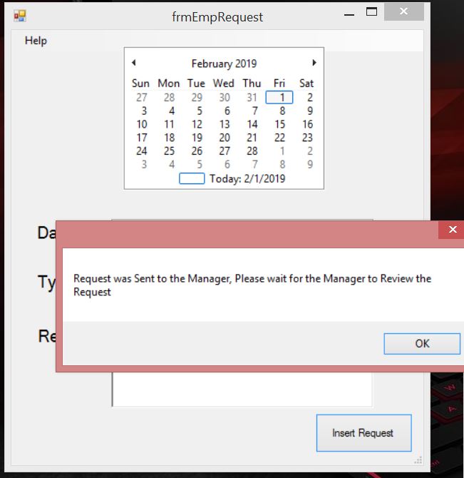 Two Weeks ago I stated my goals was to send a email to the customer info about their order like how amazon and eBay do when you purchase items and last weeks goals was to allow the manager to accept or denied employees day off request .Nest week I will implement a help file to allow the user to navigate thru the program if they don’t know not to.