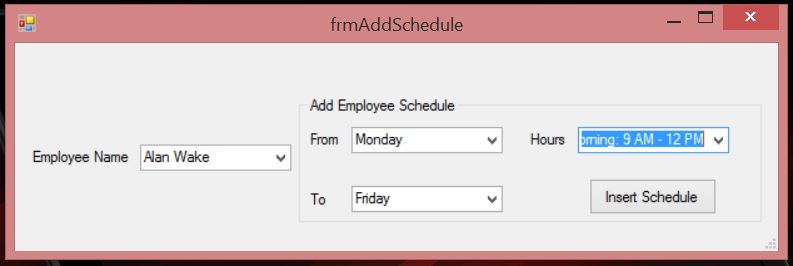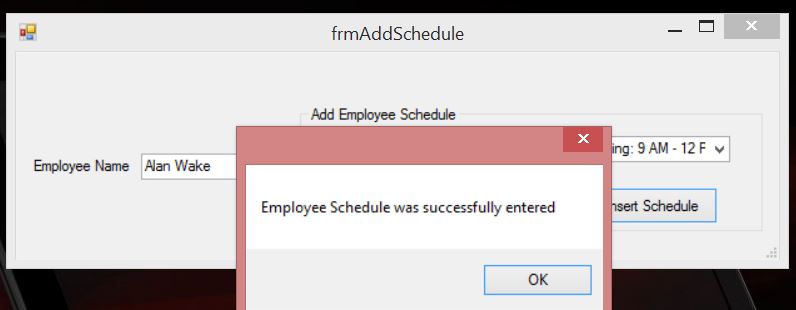 once the manager click the “insert schedule” button. a message will display that the schedule was successfully inputted and clear the value the manager has selected