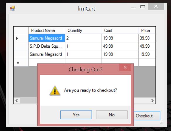 this form show all the products that the customer want to purchase. When the customer click the check out button and clicks the yes button after the prompt