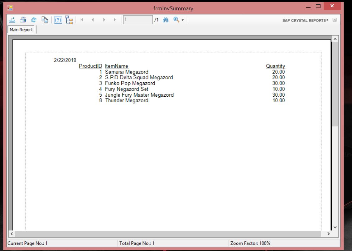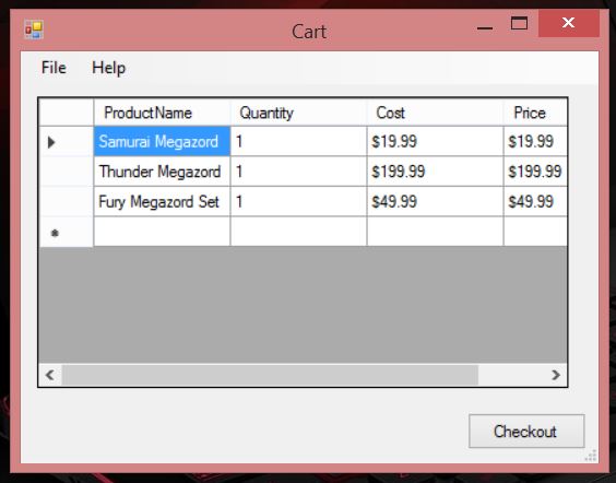 The goal of this week was allowing the customer to add item to a cart and display the contexts into a receipt. It took no time at all to create and set up a crystal report of the receipt. Next week I will work on allowing the Manager to print a copy of the inventory to see if the manager needs to restock the inventory