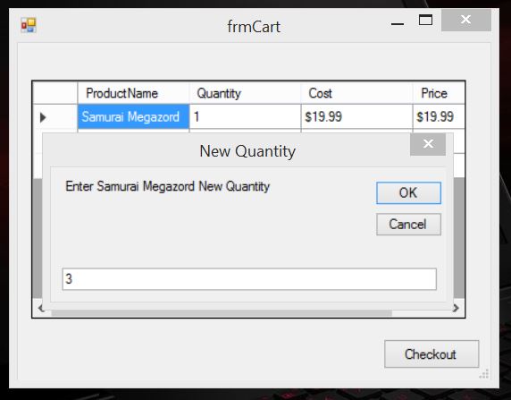 A mini input box will display asking for the the item new quantity in this case we want 3 “Samurai Megazords” instead of 1,and when we click OK.